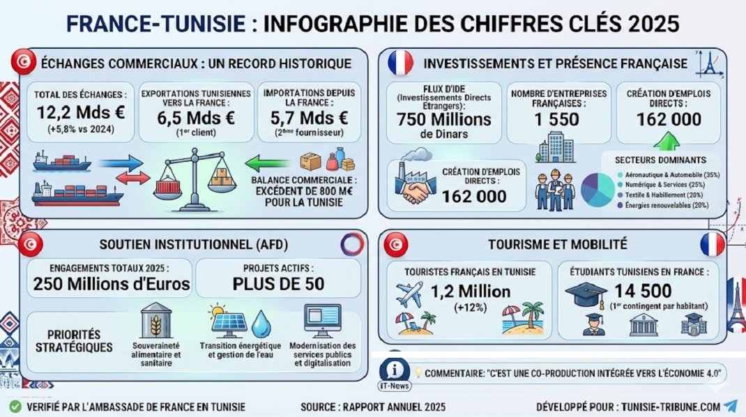 La-Tribune (France-Tunisie : Radioscopie d’un partenariat économique) – L’année 2025 marque un tournant structurel dans les relations économiques entre Paris et Tunis. Selon les derniers chiffres consolidés publiés par l’Ambassade de France, la dynamique bilatérale ne se contente plus de résister aux chocs mondiaux : elle s’intensifie et se modernise. Avec un volume d’échanges franchissant la barre des 12,2 milliards d’euros, la France réaffirme son statut de partenaire stratégique indétrônable.